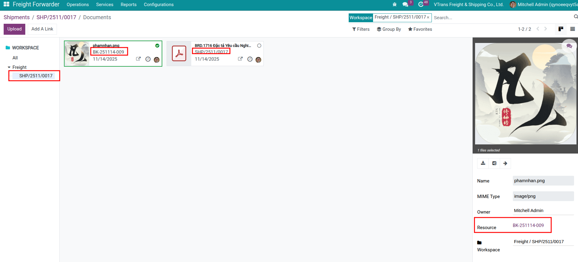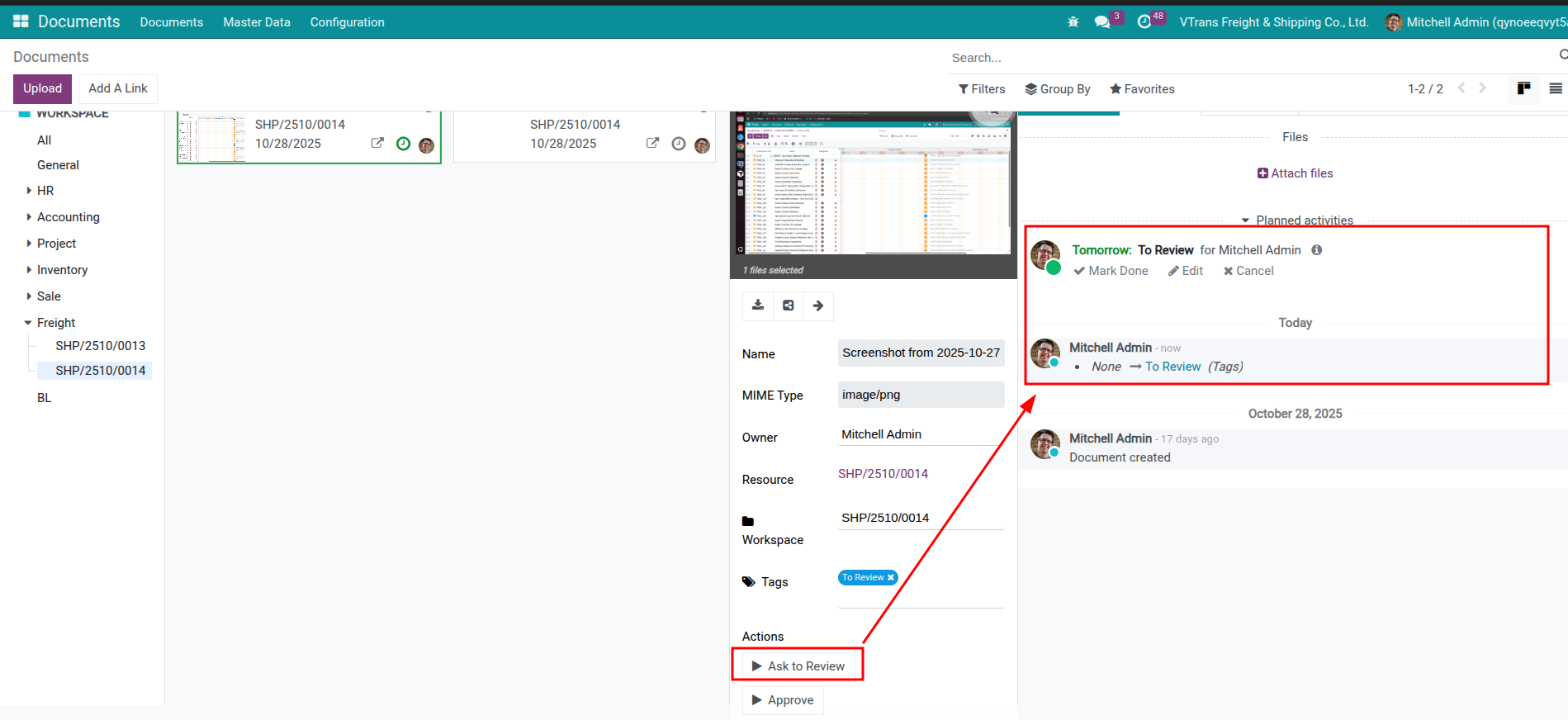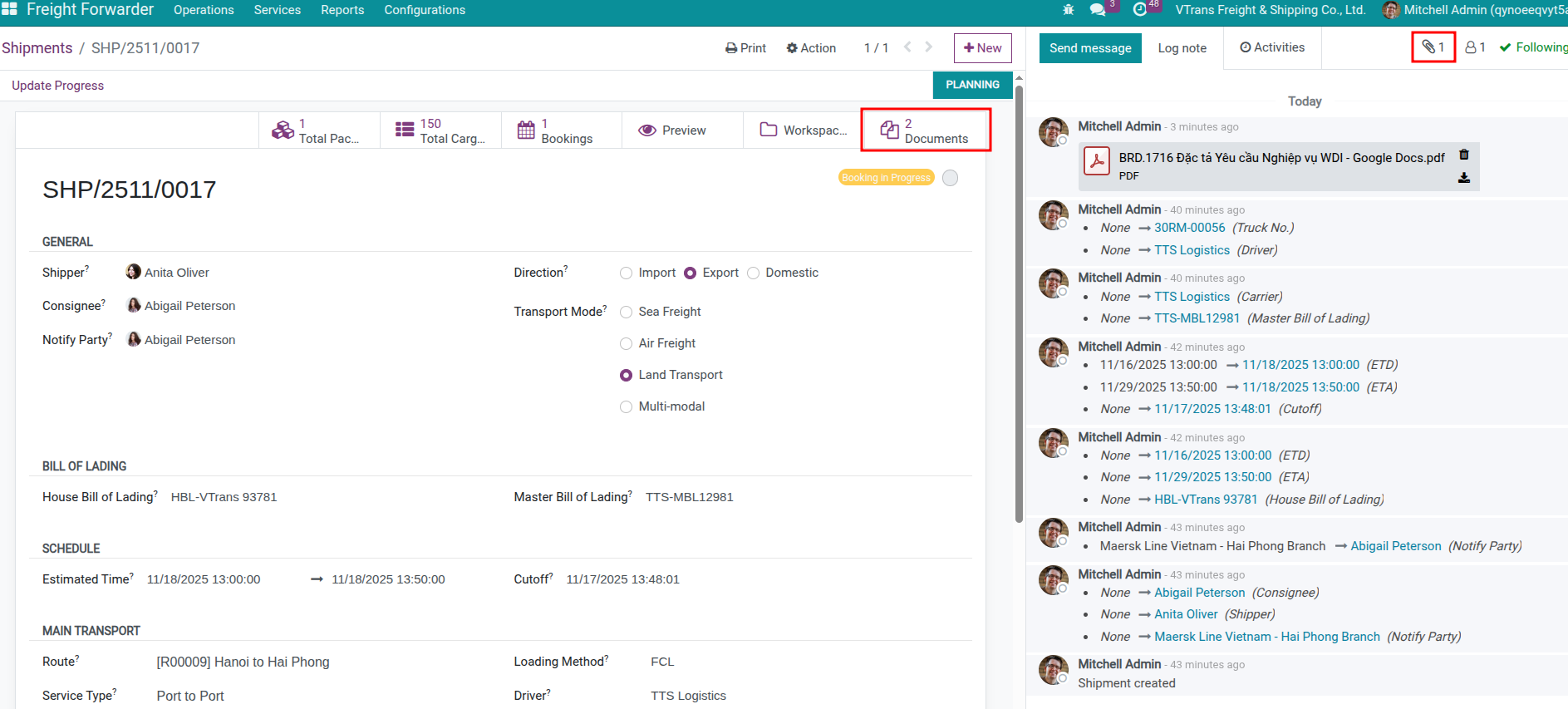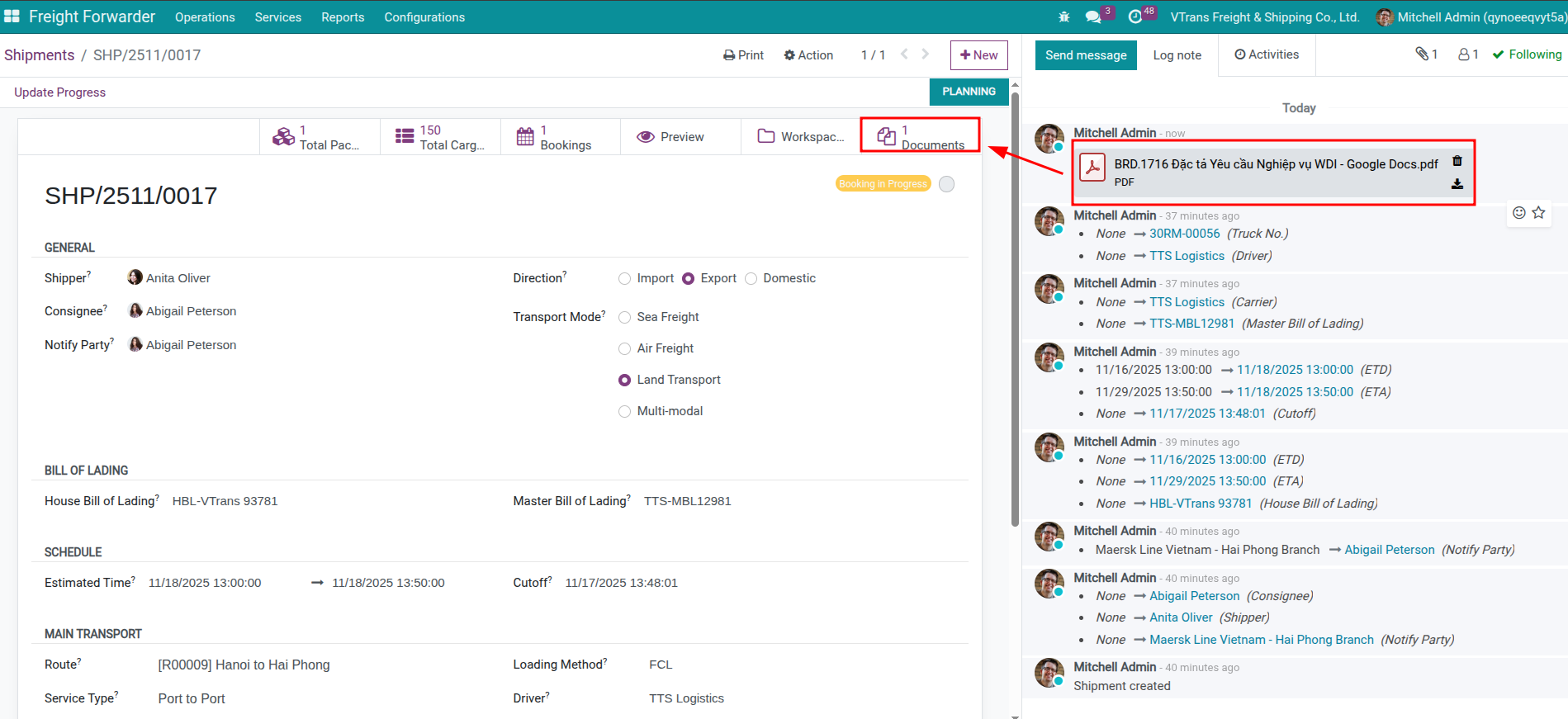 Upload files by dragging them into the shipment chatter—the system stores them in the Freight workspace and links them to the shipment automatically.