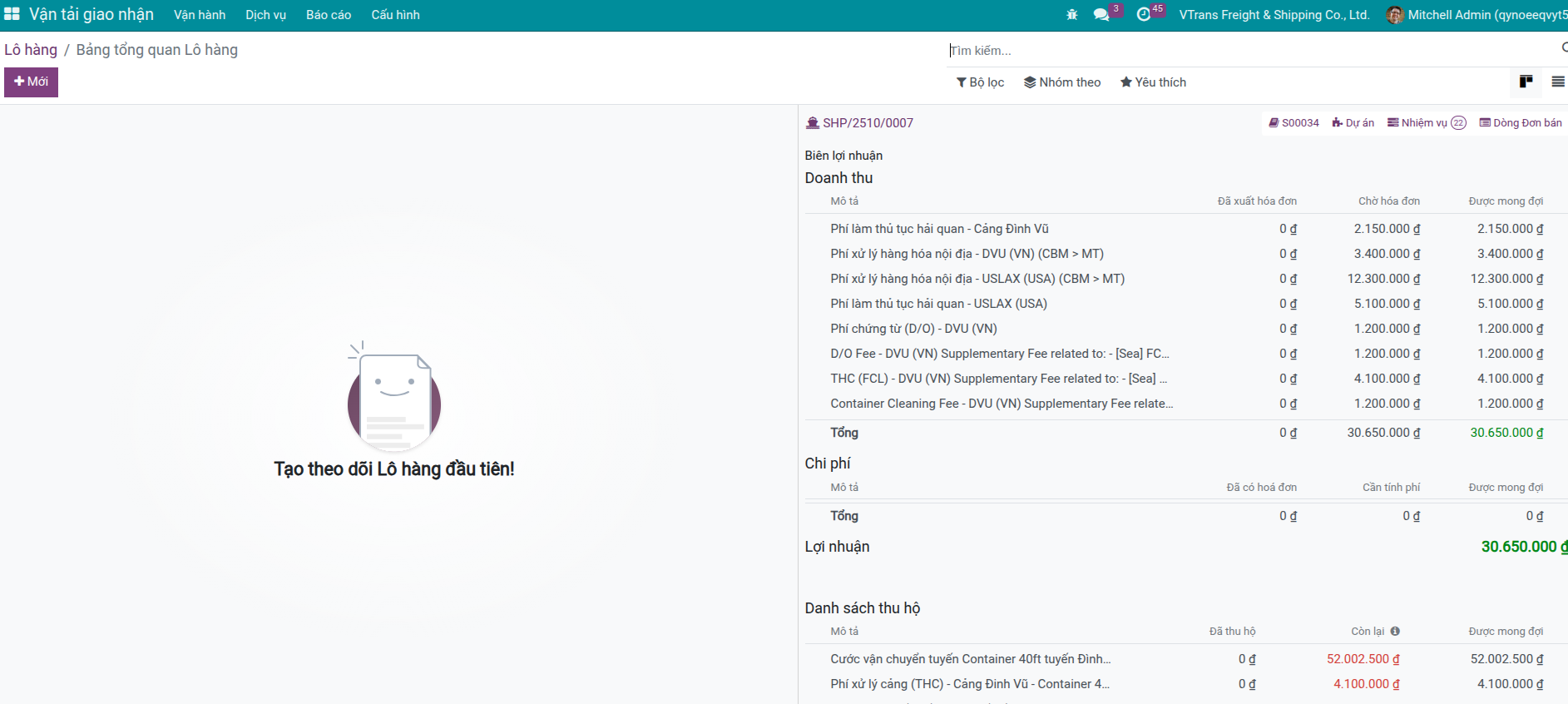 When shipments and bookings are generated from the sales order, their analytic accounts include the local and service charges, giving operations and finance the same cost baseline.