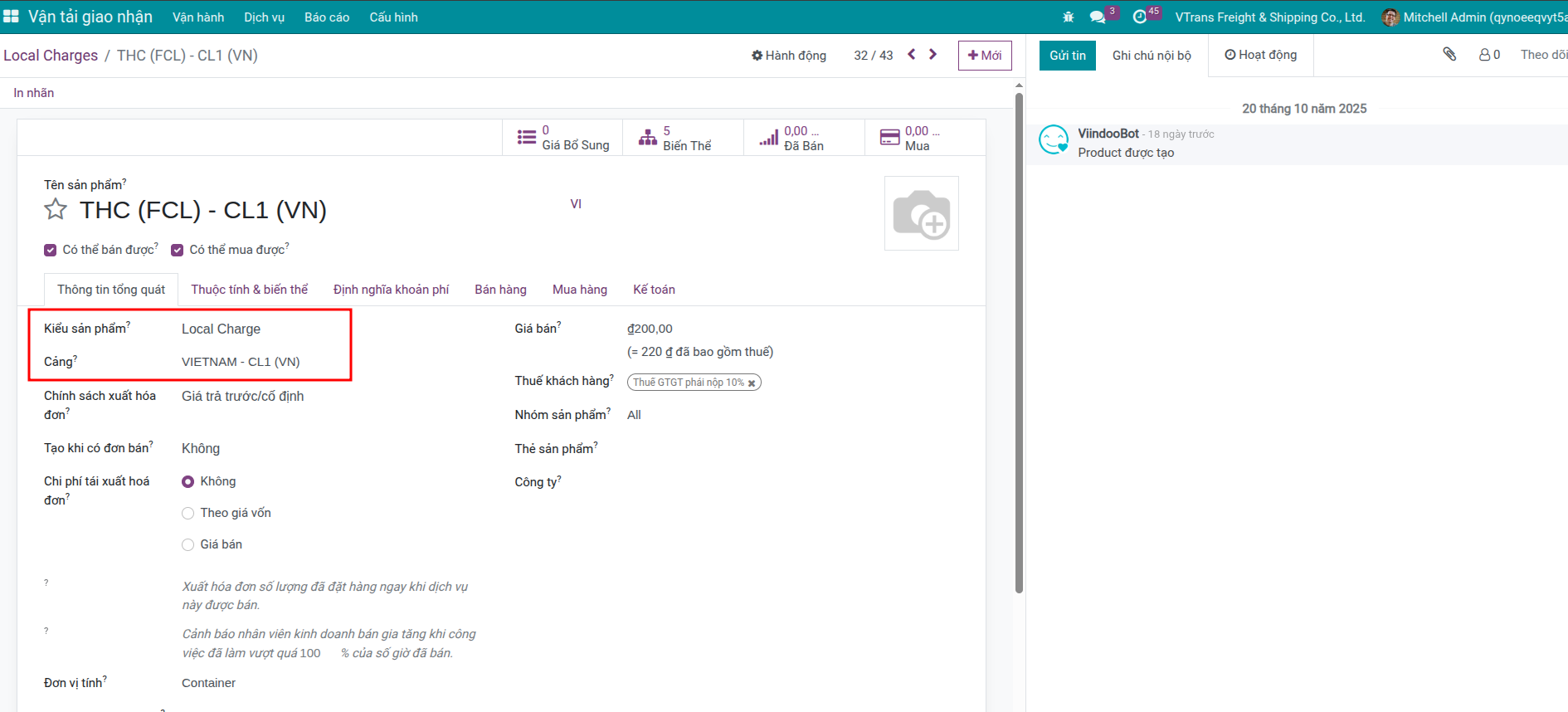Product Feessection below the main lines listing every local charge and service charge linked to the freight products.Review the generated lines: