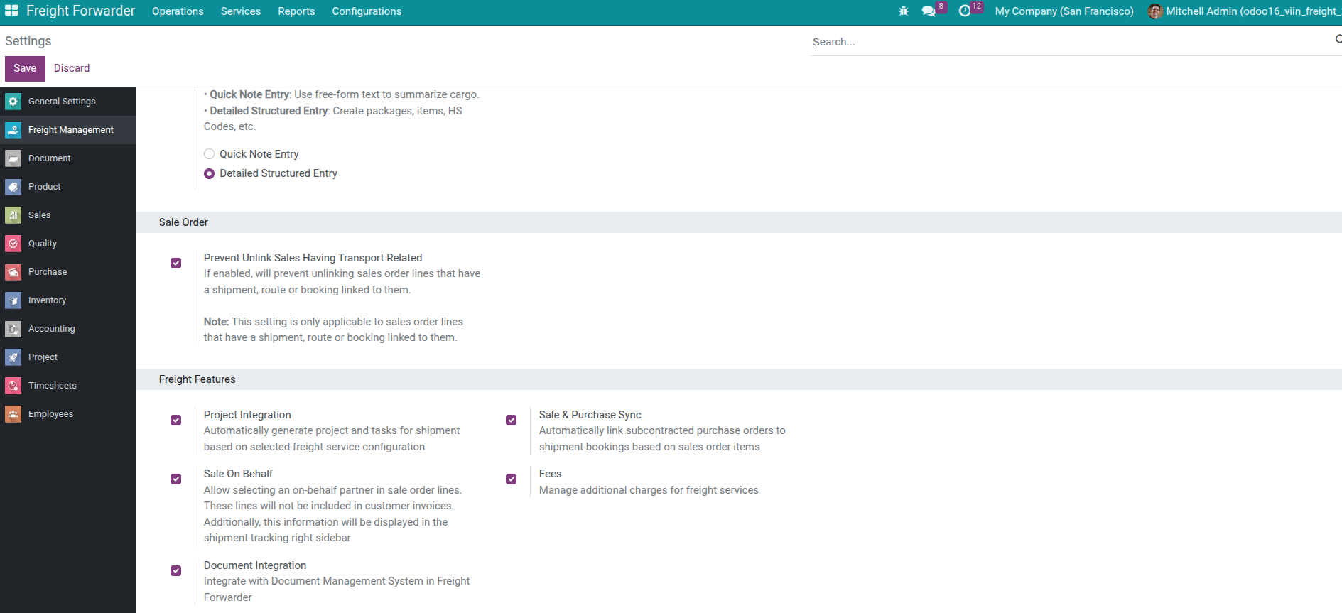 In Freight Features, enable Sale & Purchase Integration.