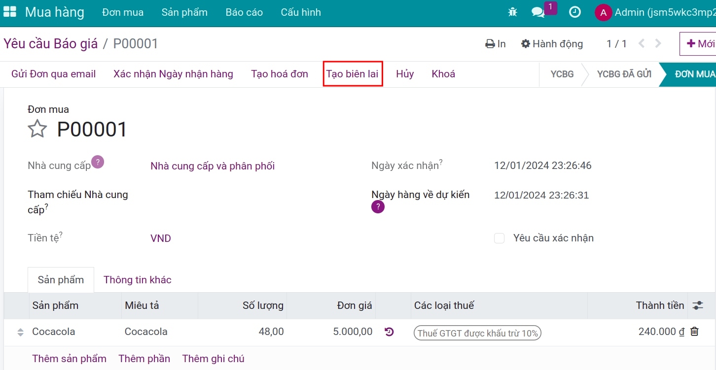 Tương tự với Hóa đơn Nhà cung cấp, bạn có thể tạo Biên lai mua hàng trực tiếp và kế thừa thông tin từ Đơn mua.