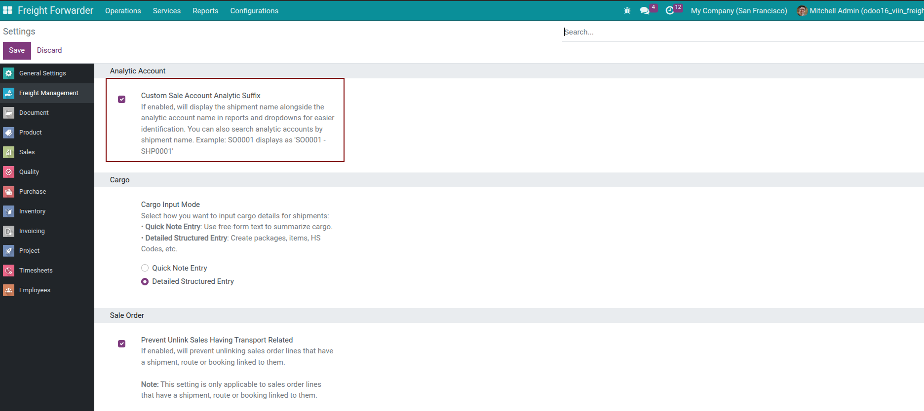 Xem lại các thiết lập Freight cơ bản—hậu tố analytic account, chế độ nhập cargo và cơ chế bảo vệ sales order—trước khi bật tính năng nâng cao.