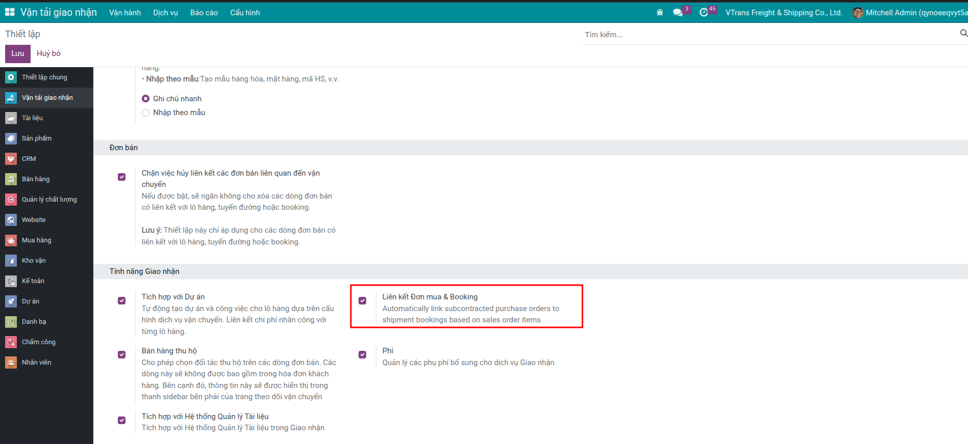 Bật Link Bookings & Purchase Orders để tự động tạo PO thuê ngoài hoặc kích hoạt khi cần mỗi lần bạn outsource leg vận chuyển.