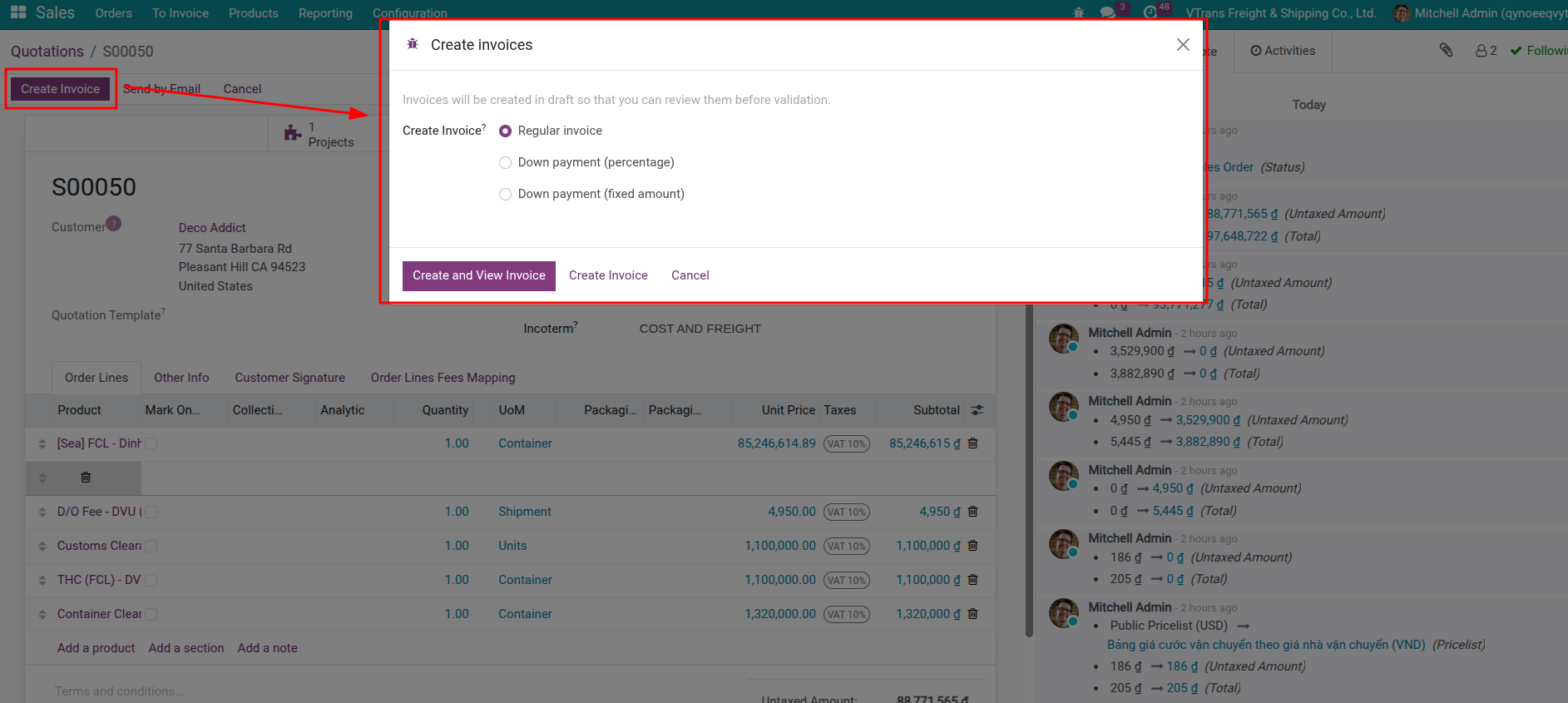 Nhấn Create Invoice và chọn chính sách xuất (thông thường, đặt cọc %, hoặc số cố định).