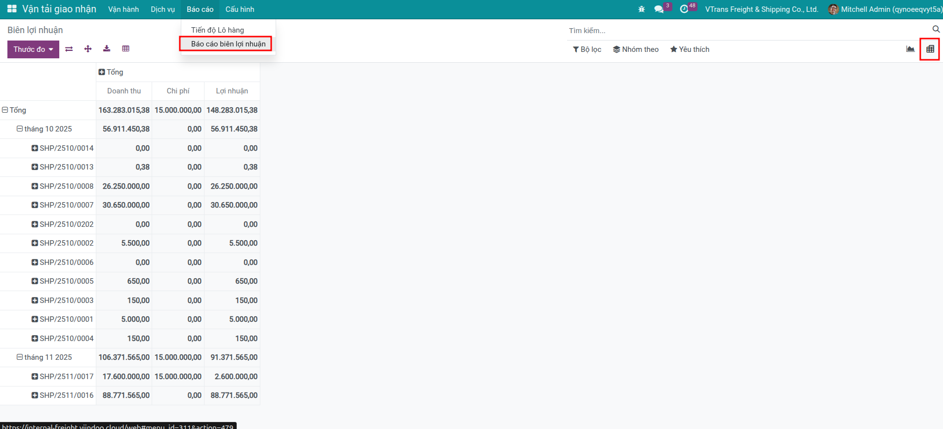 Mọi bút toán doanh thu tự động ghi vào analytic account của Shipment nên báo cáo lợi nhuận cập nhật tức thì.