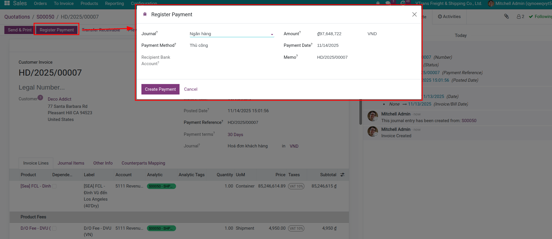 Hóa đơn khách có cả doanh thu Freight và khoản pass-through nhưng analytic account sẽ tách riêng.