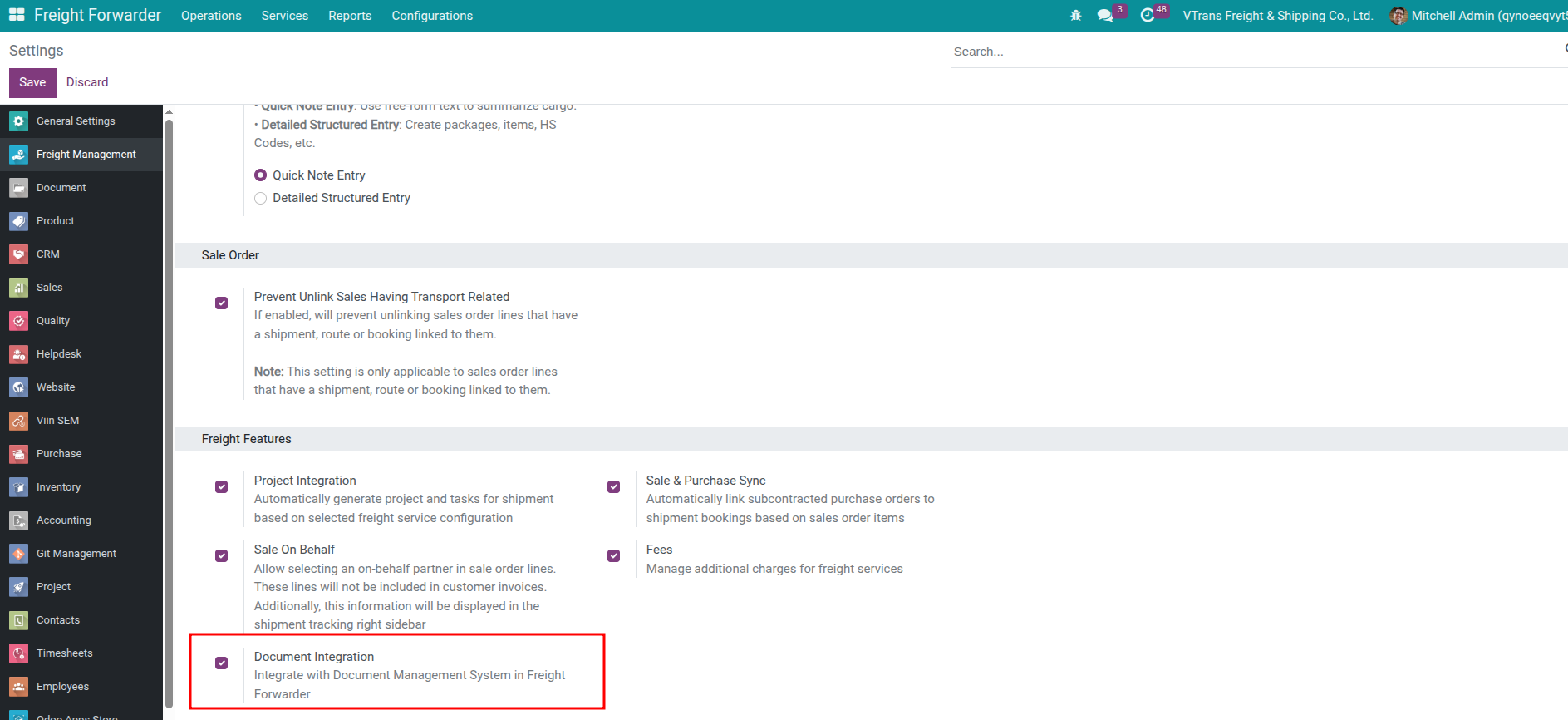 Việc này sẽ cài Viindoo Documents (Enterprise) cùng workspace và automation dành riêng cho Freight.