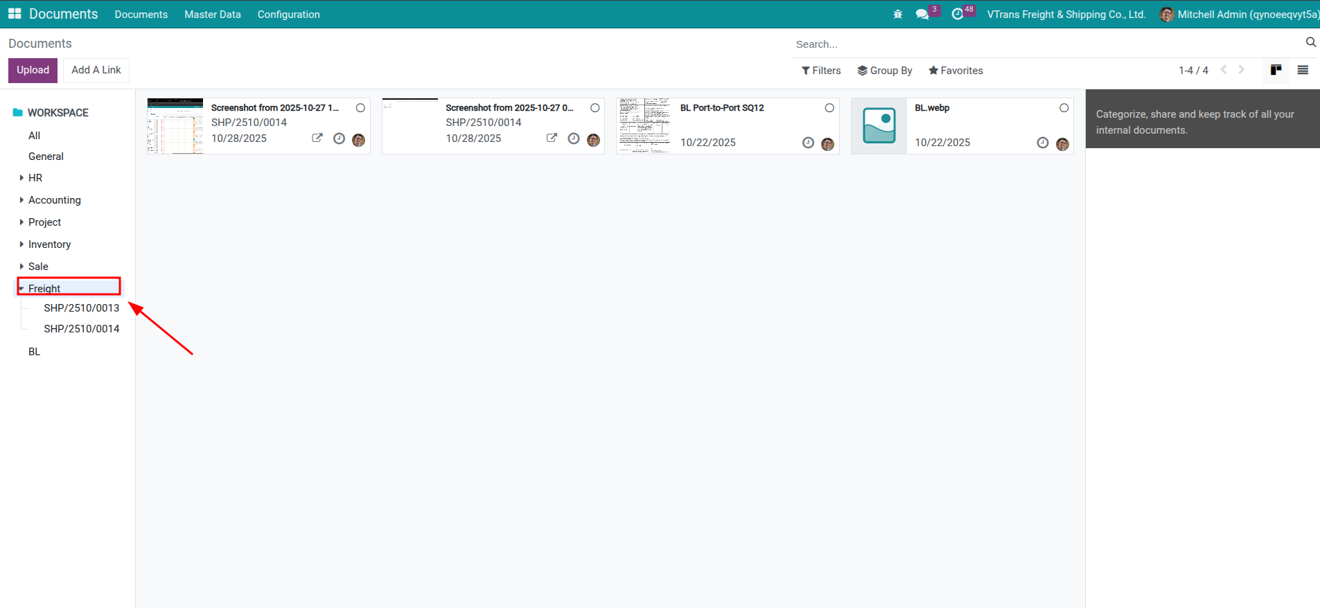 Kéo-thả file vào chatter của Shipment, hệ thống sẽ lưu trong Freight workspace và tự liên kết với Shipment.