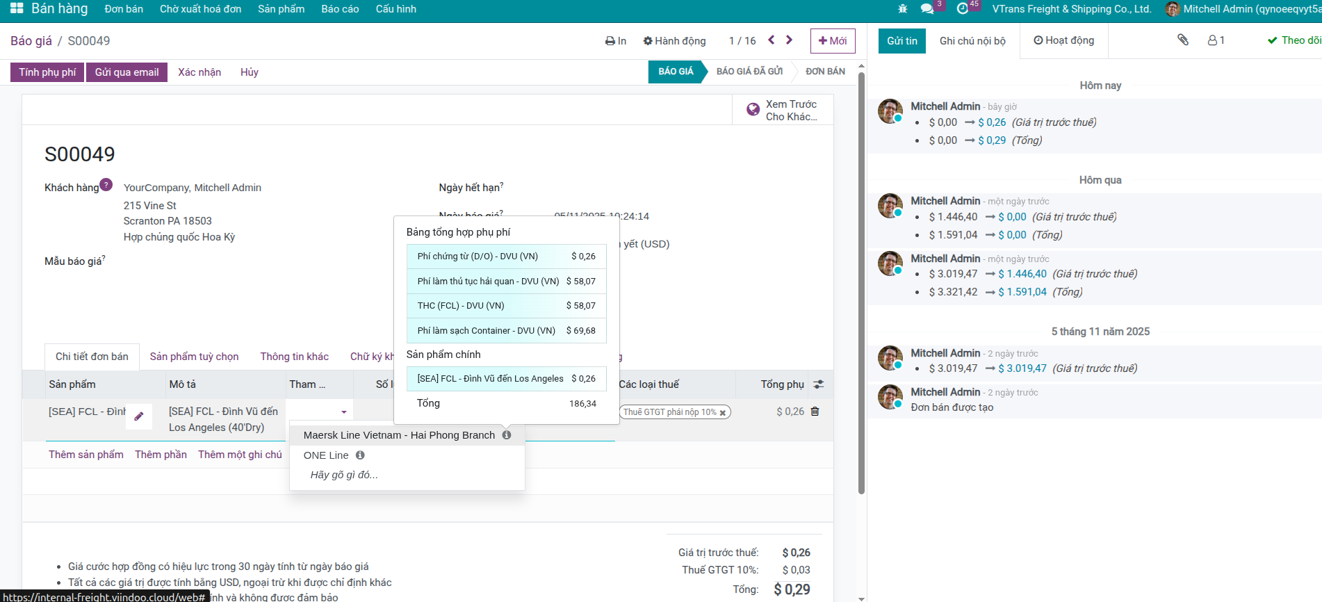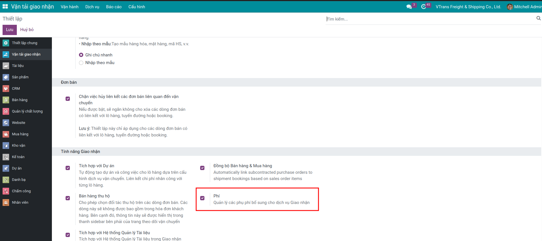 Các dòng phí tính toán được giữ trên Sale Order, chuyển sang hóa đơn khách và xuất hiện trong báo cáo lợi nhuận Shipment.