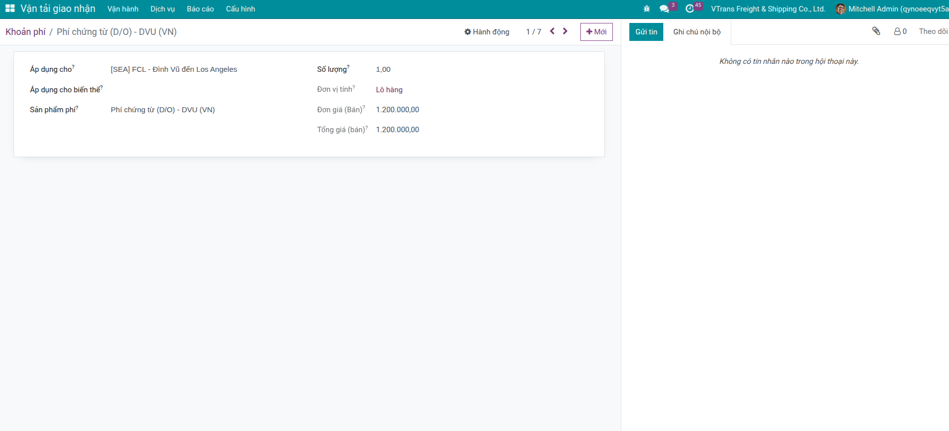 Lưu bản ghi. Phí xuất hiện ngay trên tab Fee Definitions của sản phẩm Freight. Khi Sales thêm sản phẩm đó vào báo giá, hệ thống biết cần đề xuất local/service charge nào.