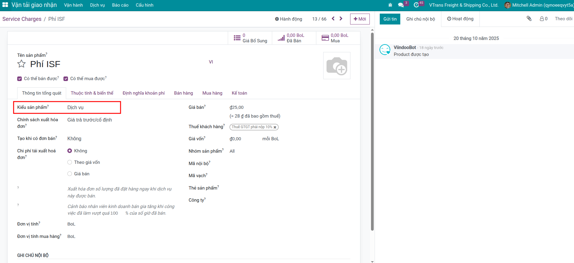 Fee Product – Local Charge hoặc Service Charge đã tạo.