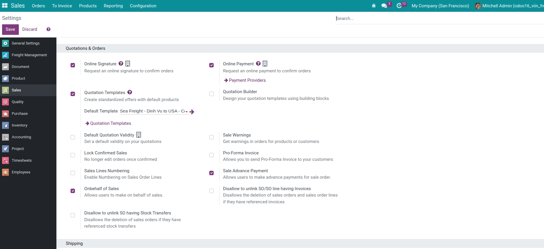 Nếu bạn dùng tiện ích Freight Project & Timesheet (viin_freight_project), hãy gắn sản phẩm freight với project template để mỗi Sales Order được xác nhận tự sinh dự án và task tương ứng.