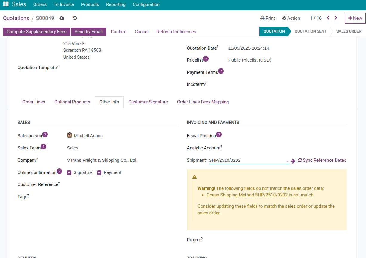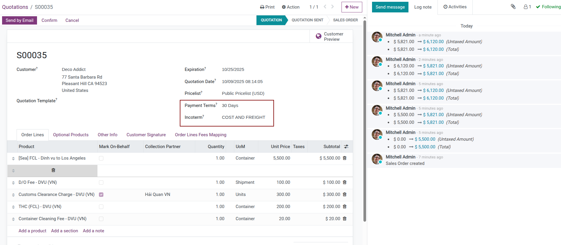 Trên form báo giá, tab Other Information, chọn Incoterm phù hợp