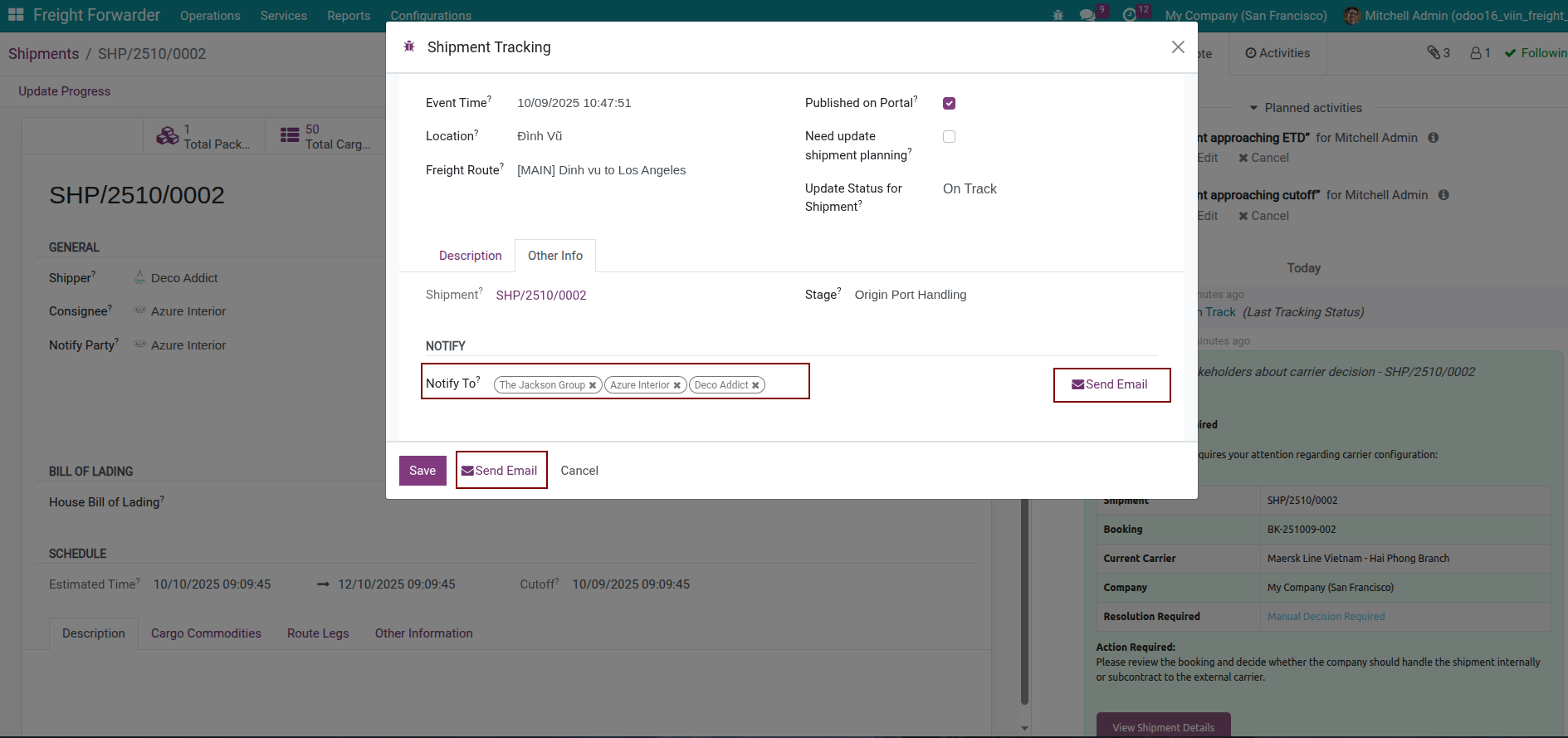 Notify To: chọn đối tác (khách, consignee...) nhận email ngay sau khi lưu.