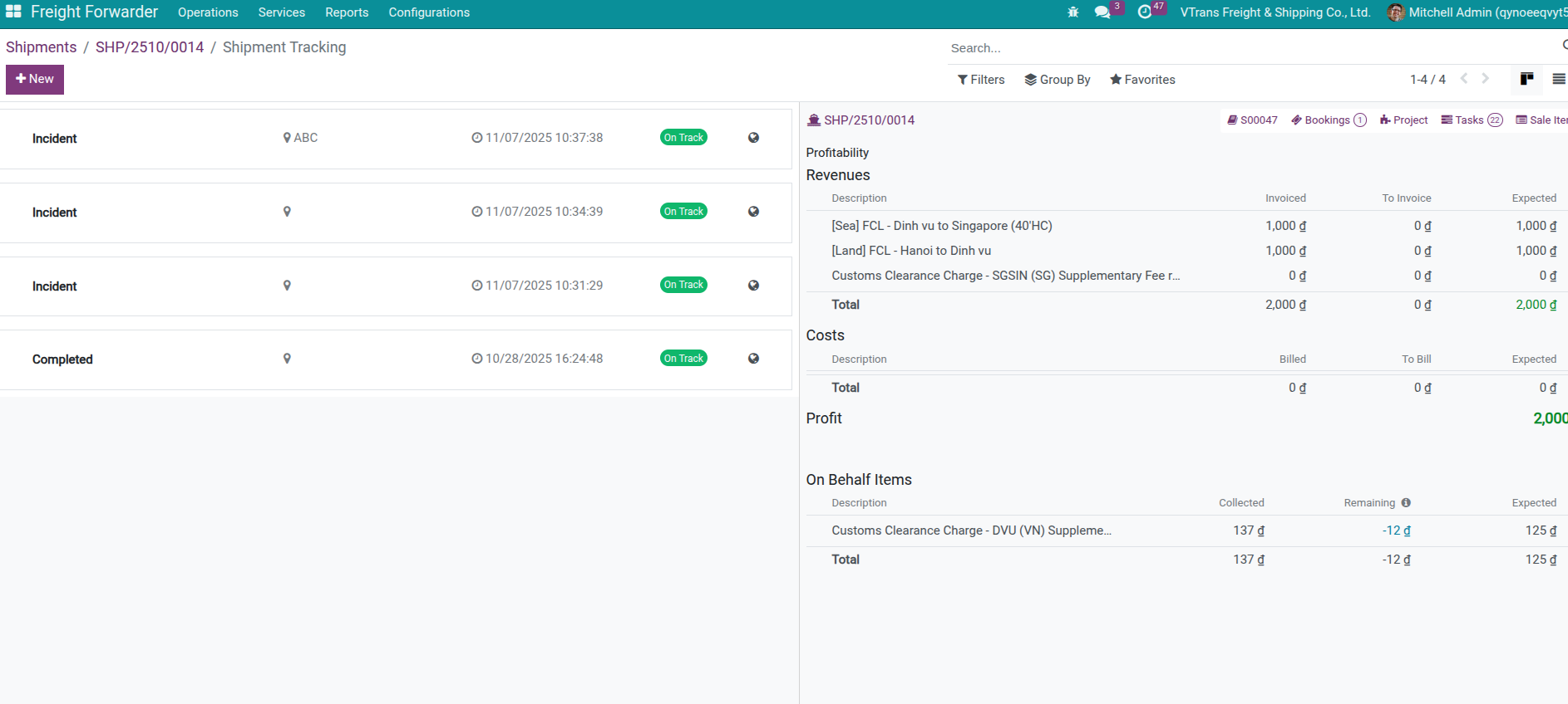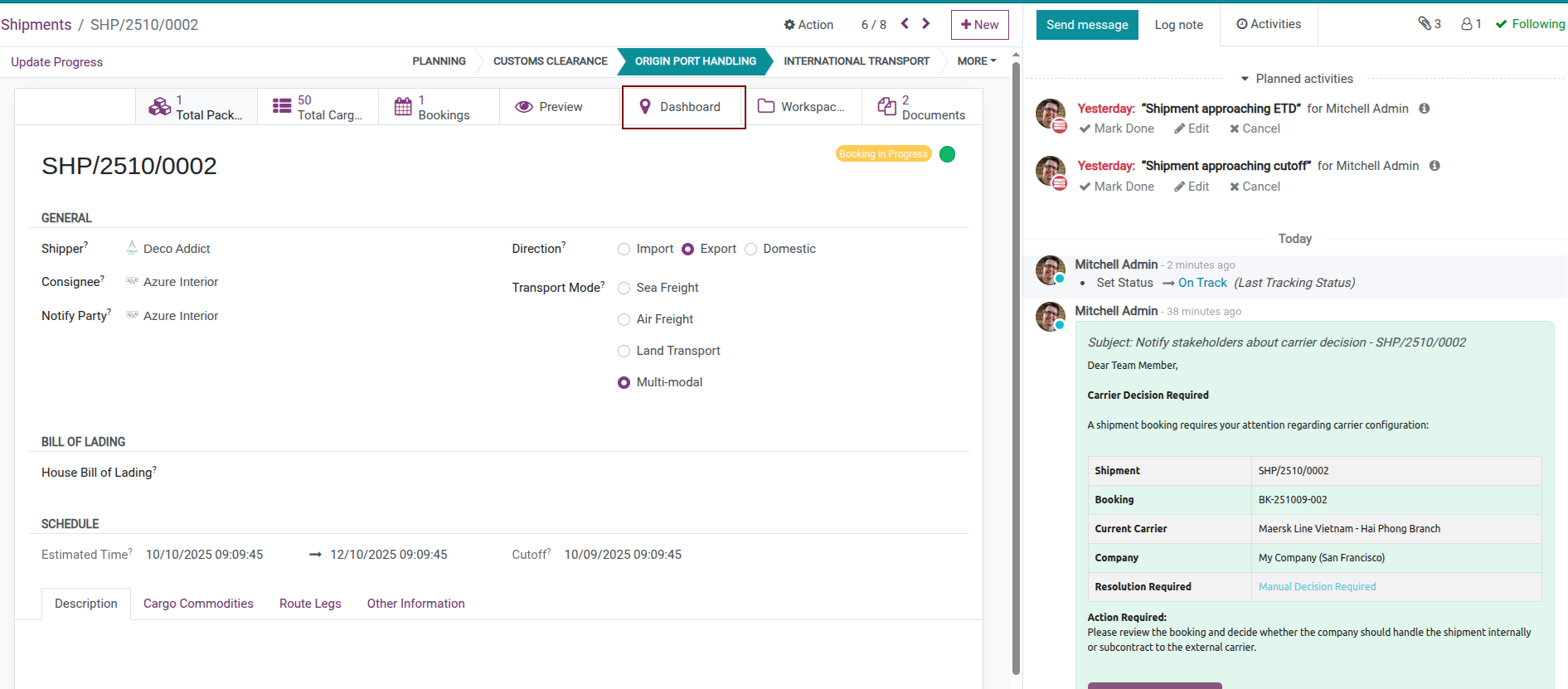 Không phải Shipment nào cũng qua đủ 7 stage. Ví dụ hàng nội địa có thể bỏ qua hải quan và vận chuyển quốc tế. Bạn có thể cấu hình stage phù hợp từng Shipment.