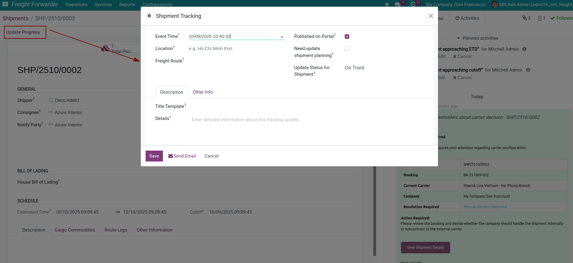 Trên form Shipment, nhấn nút Update Progress ở góc trên. Hệ thống mở form mới để nhập thông tin sự kiện.