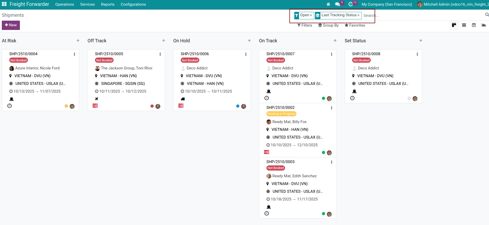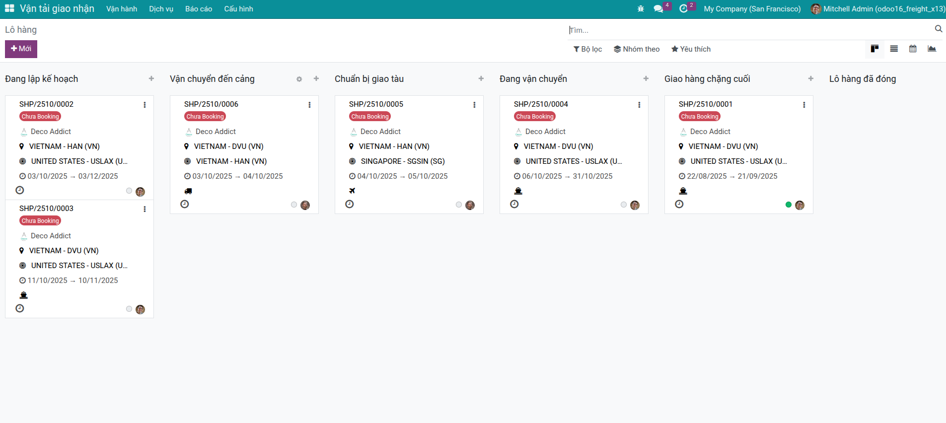 Stage = bước tiến độ (Planning → Customs → Transport → Delivery)¶