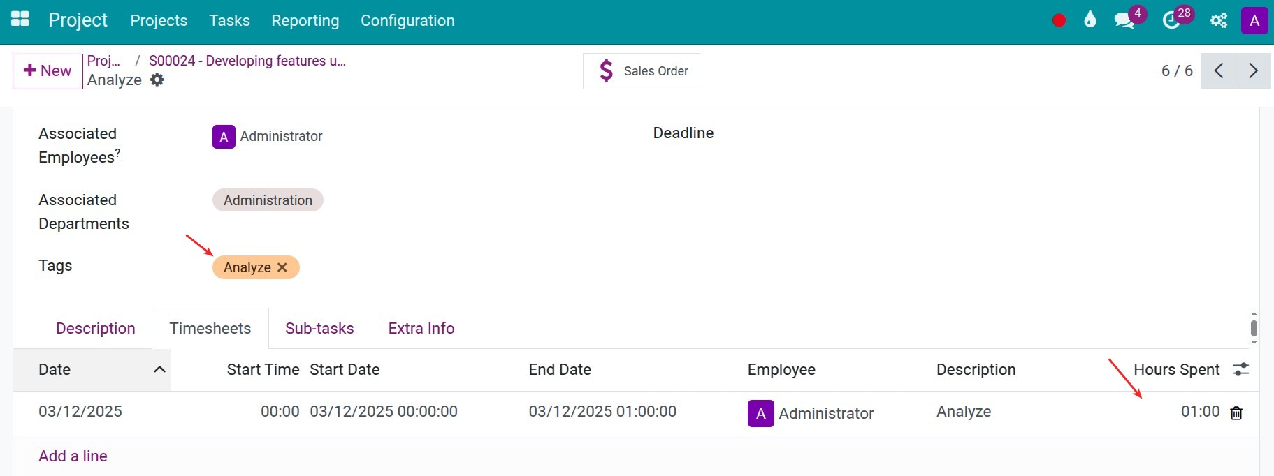Each time employees record timesheets on the relatived tasks with the corresponding tags, it will be automatically gathered to the project budget.