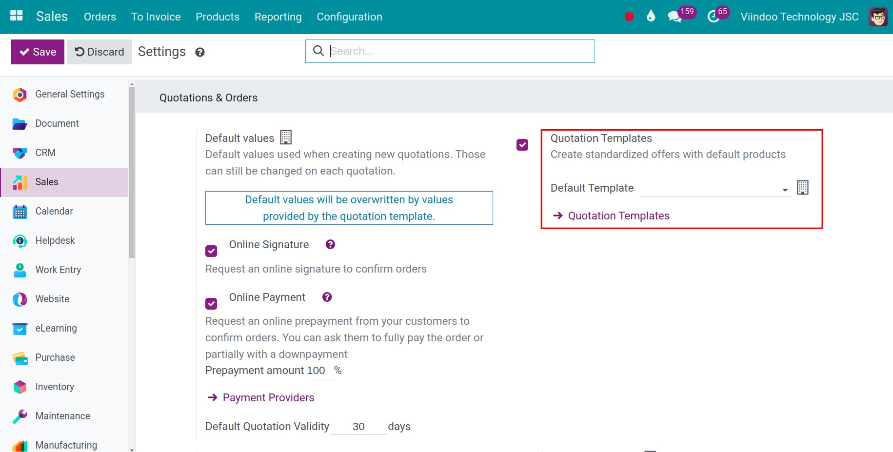 To avoid wasting time composing multiple quotations in a sales process, you can create some quotation templates by activating the Quotation Templates feature of the Viindoo Sales app.