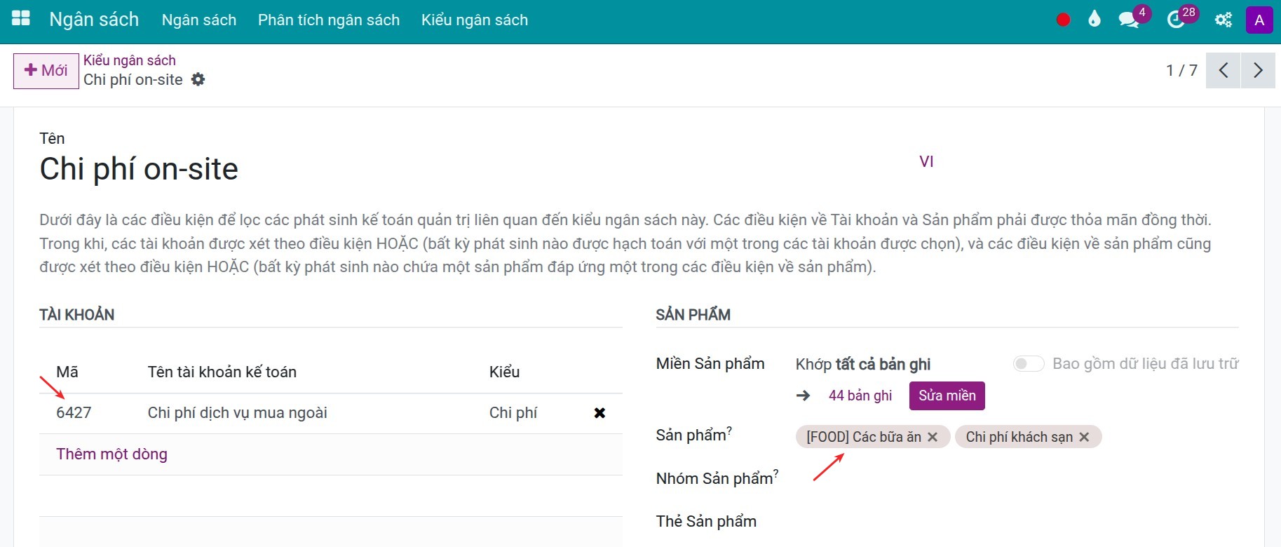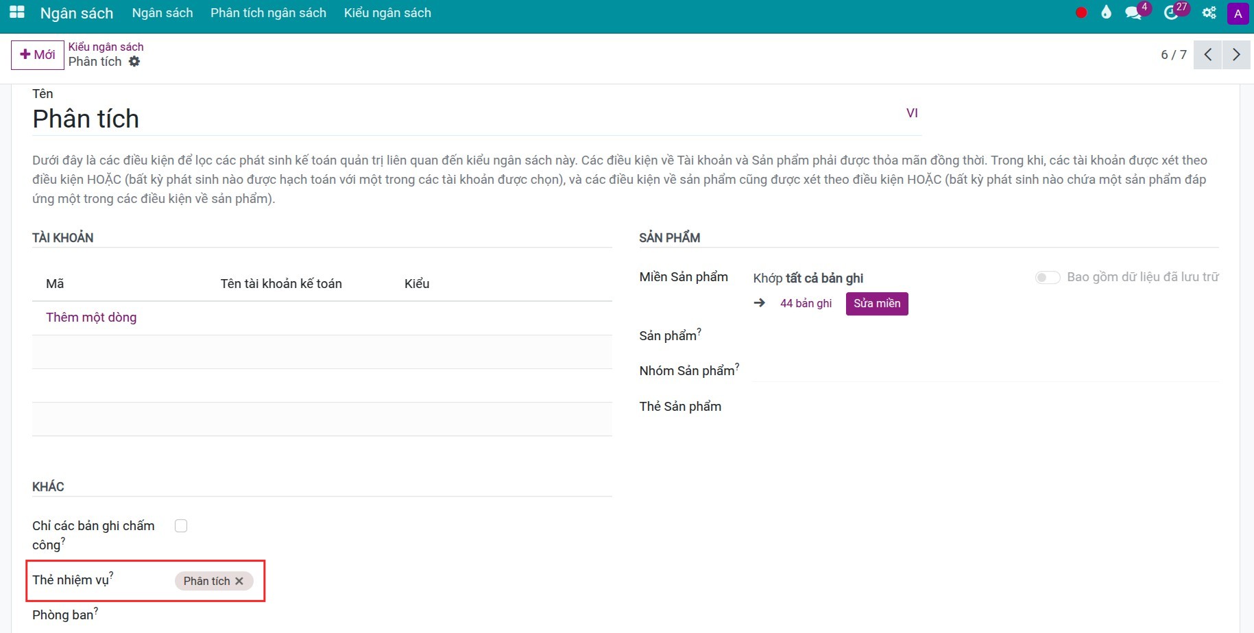 Kiểu ngân sách phục vụ việc phân tích chi phí mua ngoài: Sử dụng quy tắc về Sản phẩm or Nhóm sản phẩm hoặc Thẻ sản phẩm hoặc Tài khoản kế toán.
