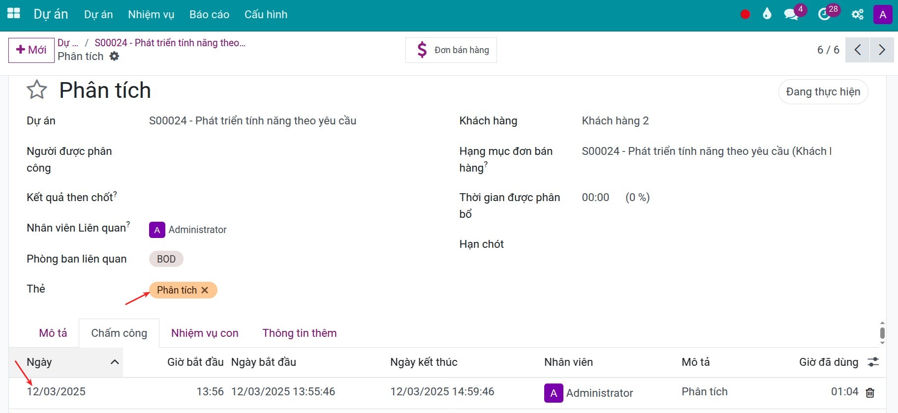 Mỗi khi nhân viên thực hiện chấm công trên các nhiệm vụ liên quan với các thẻ tương ứng, chi phí nhân viên sẽ tự động được tổng hợp vào chi phí thực tế của dự án.