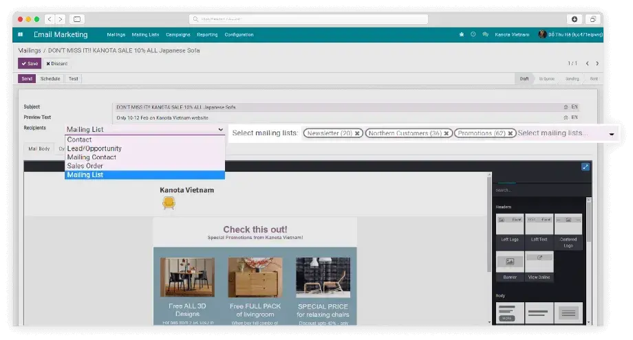 - Quickly quantify numbers of potential leads, orders, earned revenue created via each email - thanks to the integration with Viindoo CRM.
