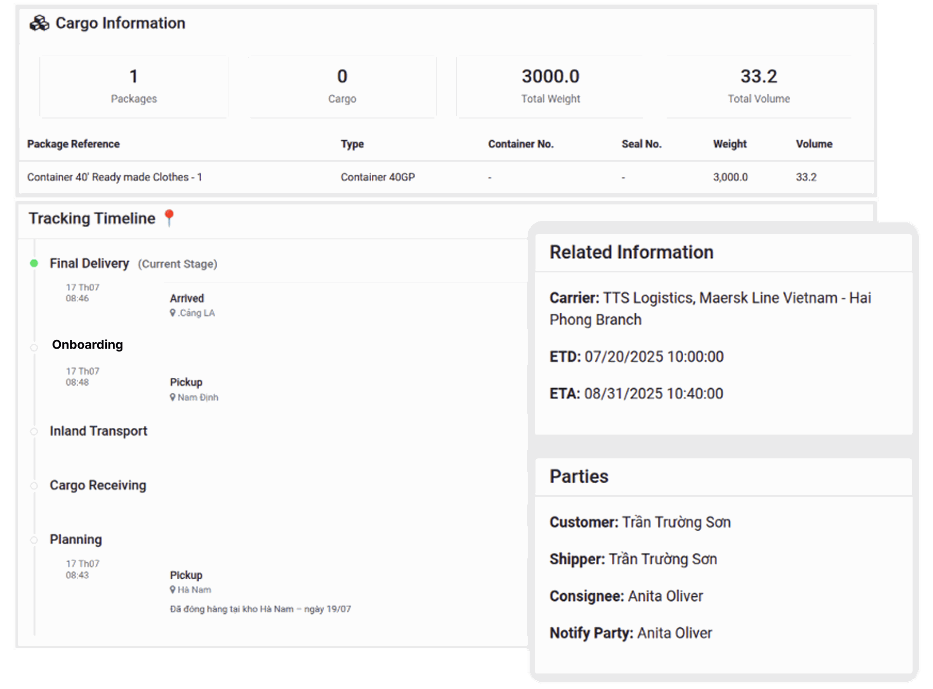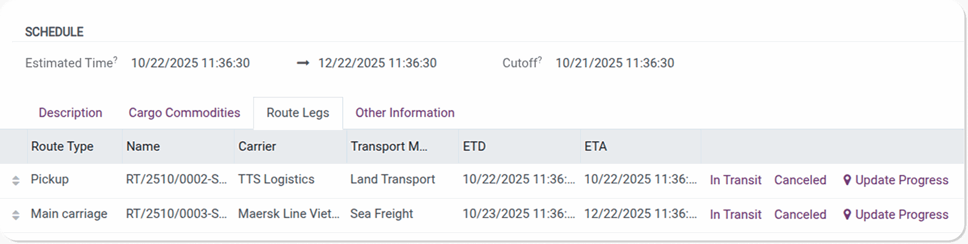 - Includes full details of route, legs, ETA, ETD, cut-off, etc.