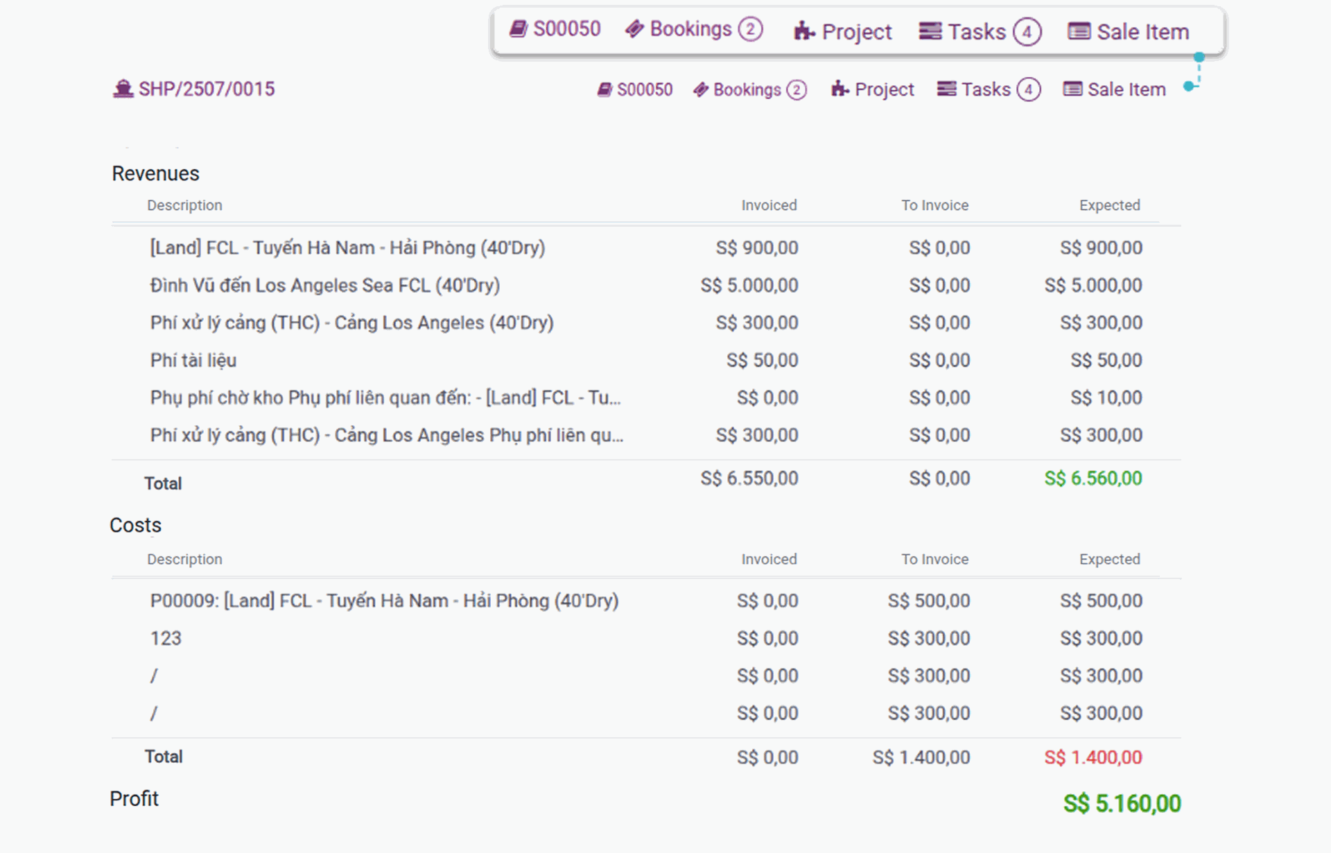 Data seamlessly flows across stages: quotation → shipment → booking → documents → accounting