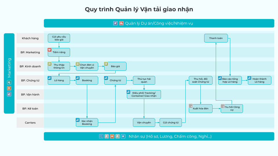 - Chuẩn hóa quy trình nghiệp vụ theo chuẩn quốc tế; mọi đơn hàng, lô hàng, booking, chứng từ đều được tự động tạo và liên kết xuyên suốt.