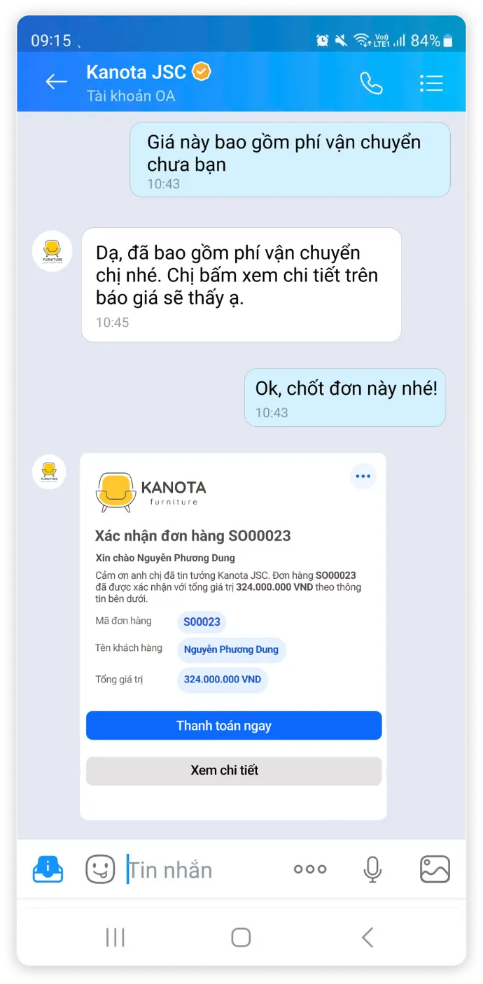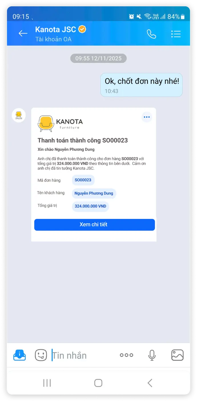 Khách nhắn tin Zalo -> Sale nhận thông báo tức thì